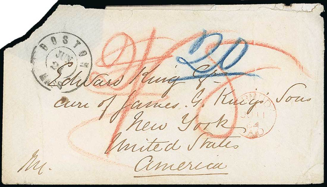 1864 (11 June) double rate envelope from St. George's to New York per Delta to Halifax and thence per Africa to Boston, mis-rated "2/-" (deleted) as if to Great Britain, "8" for double rate to U.S. and "20" in blue crayon for double U.S. steamship rate, showing light "bermuda/paid" datestamp (P4) and Boston transit datestamp (26.6); envelope with faults though rare with only thirteen of the P4 datestamps recorded. Photo