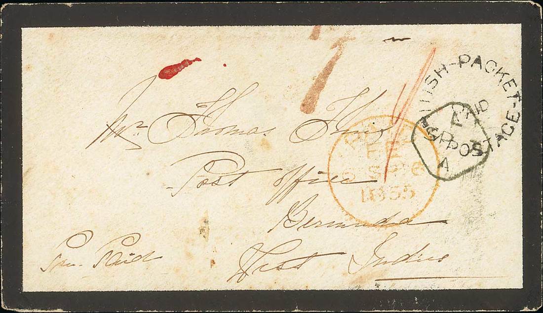 1855 (25 July) mourning envelope from Colombo, Ceylon to "Post Office, Bermuda, West Indies", per P&P Hindustan to Suez, Indus to Southampton, per Cunard America from Liverpool to Halifax and Merlin to Bermuda, rated "1/-" (6d. Ceylon to G.B. and 6d. from G.B. to Bermuda) alongside "d1" credit to Bermuda handstamp and showing "british packet/postage/paid" handstamp, London (6.9) and Liverpool (7.9) datestamps and with Colombo Steamer Letter datestamp on reverse; light horizontal fold towards foot. The only recorded cover from Ceylon to Bermuda. Photo