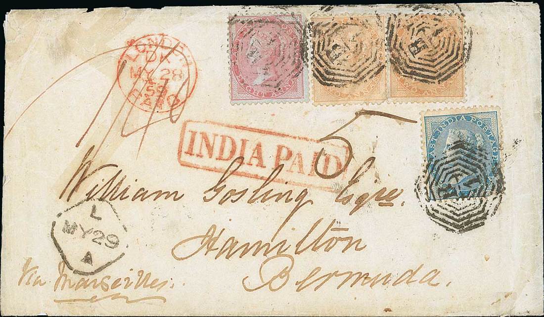 1859 (23 Apr.) envelope (opened-out) from Calcutta "via Marseilles" to Hamilton, per Europa to Halifax where misdirected to Hamilton, Ontario and re-routed back to Halifax and then per Delta to Bermuda, bearing 1855 blued paper 8a. carmine in combination with 1856-64 ½a. blue and 2a. yellow-buff (2) all clearly cancelled "B/1", showing manuscript "1/4d" packet rate and "5" credited to Great Britain, and with framed "india paid" handstamp, London (28.5) and Liverpool (29.5) datestamps, all on face, the reverse with "missent-to" handstamp followed by Hamilton datestamp (14.6) followed by curved-framed "canada" handstamp, together with Calcutta, Quebec and Hamilton datestamps; adhesives with a few small imperfections though a remarkable franking, full of character. The only recorded cover from Bermuda to India. Photo