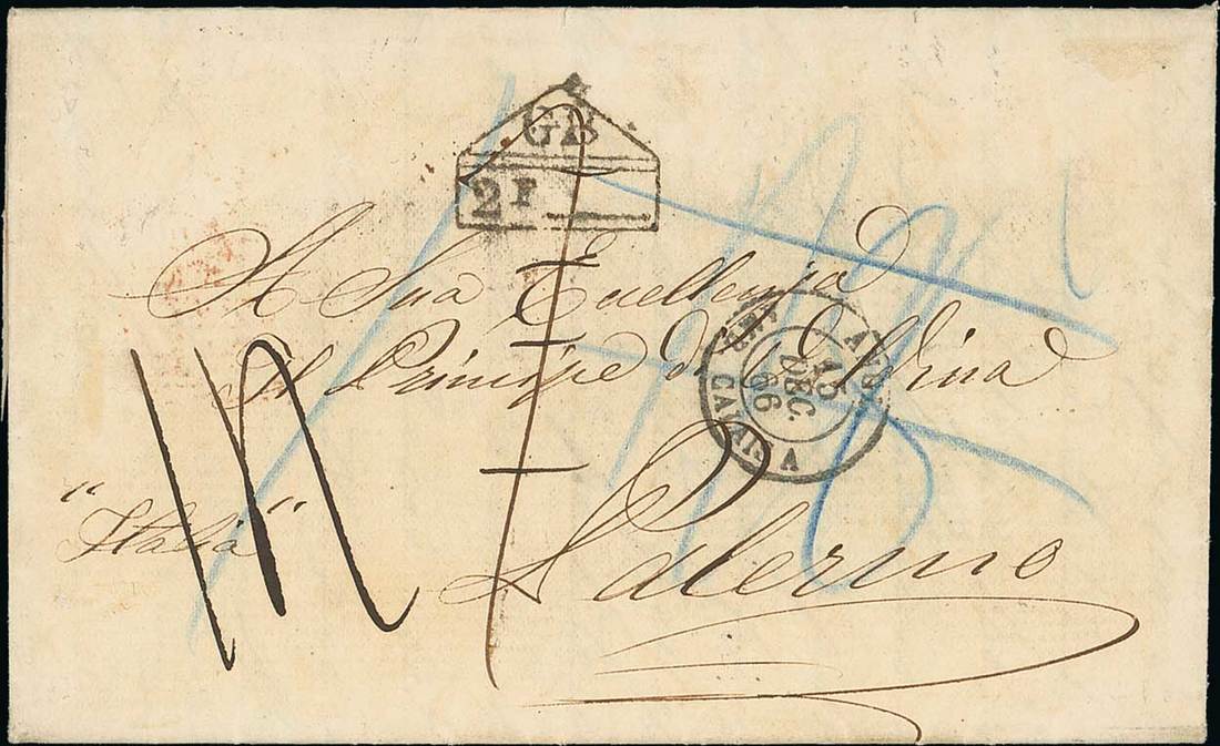 1866 (13 Nov.) entire letter from St. George's to Palermo, Sicily, per Delta to Halifax and Africa to Liverpool, rated "1/9" (not prepaid), blue "1/8" due to Great Britain (deleted), "1" to Bermuda and French "14" decimes transit postage, showing "gb/2f" accountancy handstamp and, on reverse, St. George's (PM5) datestamp and a variety of transit datestamps, arrival on Christmas Day. The only recorded cover from Bermuda to Sicily. Photo