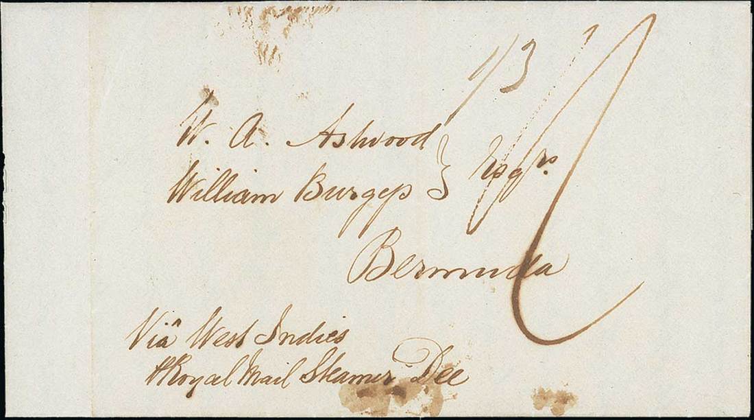 1842 (15 Jan.) entire letter from London to Messrs. Astwood and Burgess, from Falmouth "Via West Indies p Royal Mail Steamer Dee", per Clyde to St. Thomas and per Thames to Bermuda, rated "1/-" (postage) and "1/3" (postage + 3d. internal = 1/3d. due) and with despatch datestamp on reverse. A rare cover carried on the first trip to Bermuda by RMSP. Photo