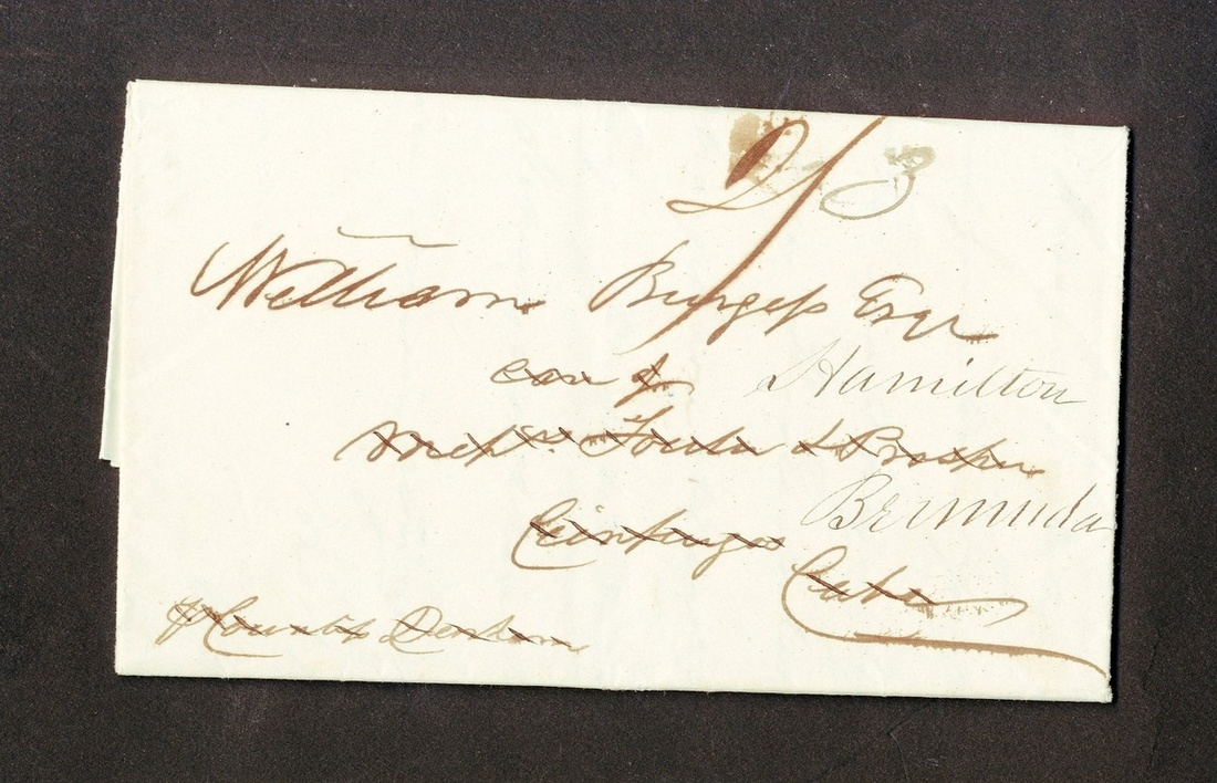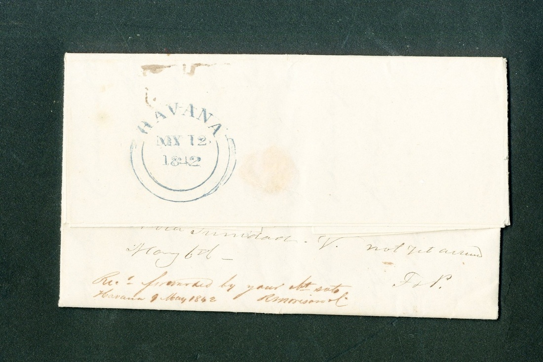1842 (9 Apr.) double rate entire letter from Kingston, Jamaica to William Burgess care of Fowler & Prosper, Cienfuegos, Cuba, sent from Trinidad de Cuba to Cienfuegos per non-RMSP vessel Countess Durham where forwarded to R. Morrison & Co. in Havana who sent it per Dee to Bermuda, rated "2/3" (double 1/- plus 3d. internal), the two forwarding agents endorsements and superb Havana double-arc datestamp (12.5) on reverse
