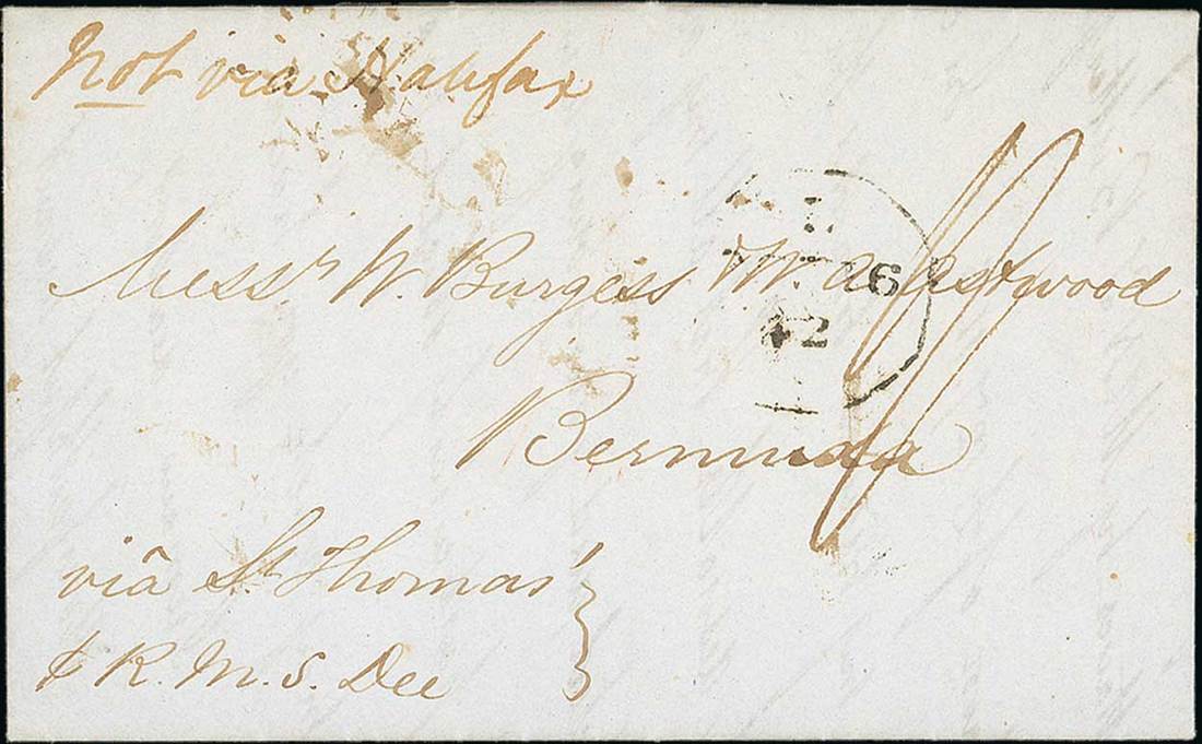 1842 (15 Oct.) entire letter from London to Bermuda "via St. Thomas p R.M.S. Dee" and subsequently "Not via Halifax", missing the Dee and sent on to Liverpool for the Cunard steamer rather than waiting for Tay leaving on 1 November, rated "1/-" and with Liverpool datestamp (16.10) on face, two London datestamps on reverse. An unusual item of delayed mail. Photo