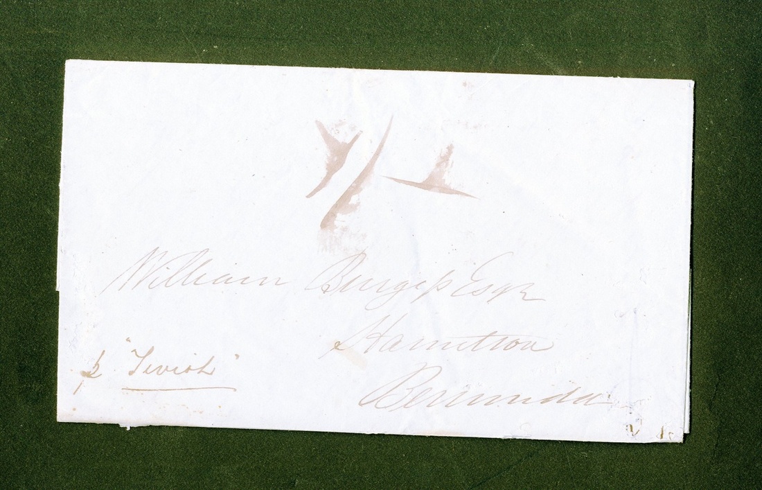 After 1 October 1842 ships left Southampton stopping at Falmouth which remained the packet terminus until 1 September 1843 when Southampton became the terminus. No stop was made at Falmouth after that date. After 20 July 1842 no internal Bermuda postage was collected on incoming mail