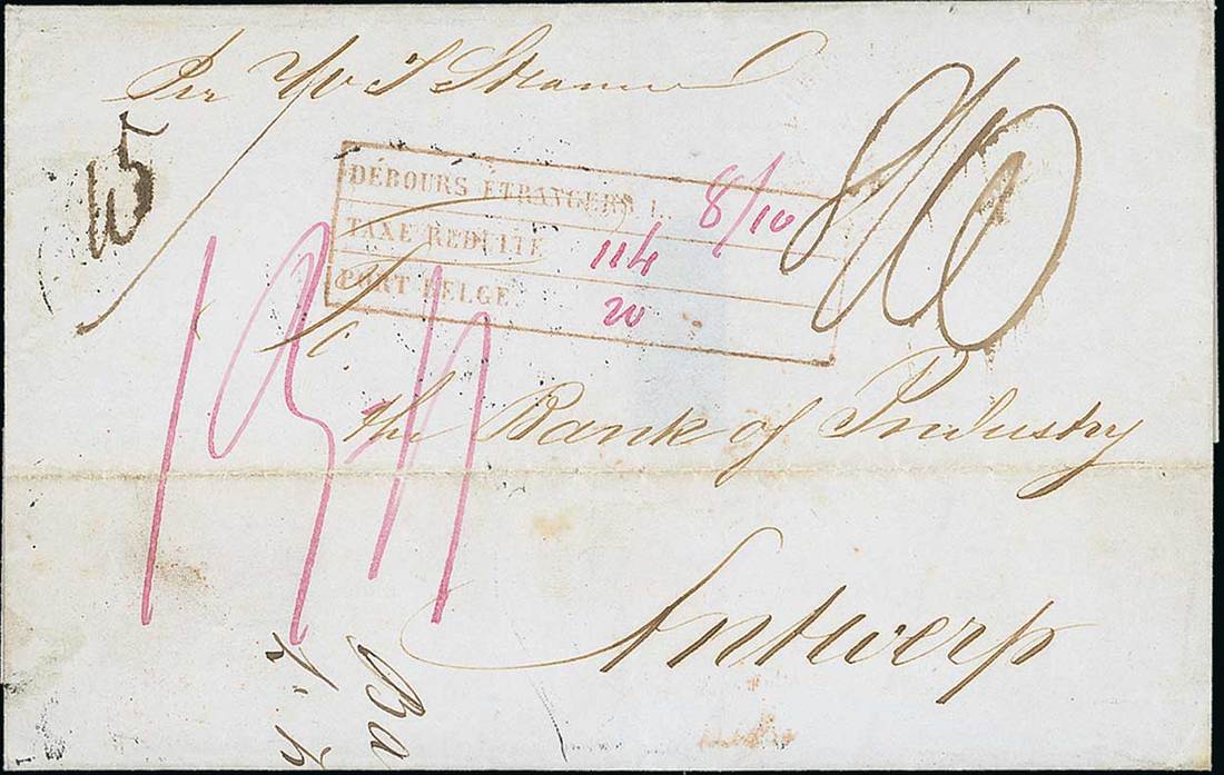 1843 (1 Oct.) double rate entire from Mexico "Per M.P. Steamer" to Belgium, sent from Vera Cruz per Severn to Bermuda, per Trent to Southampton and then via Ostend to destination, showing rate handstamp inscribed "débours etrangiers" for "8/10" (2 x 4/6 less 1d. concession to London), "taxe reduite" for "114" (centimes = 1/-) and "port belge" for "20" (centimes Belgian internal postage) and showing, on reverse, superb despatch, London (7.11), "angleterre/par ostende" (8.11) and arrival (9.11) datestamps; full of character and a rare destination demonstrating the importance of Bermuda in transatlantic communication from the western Caribbean. Photo