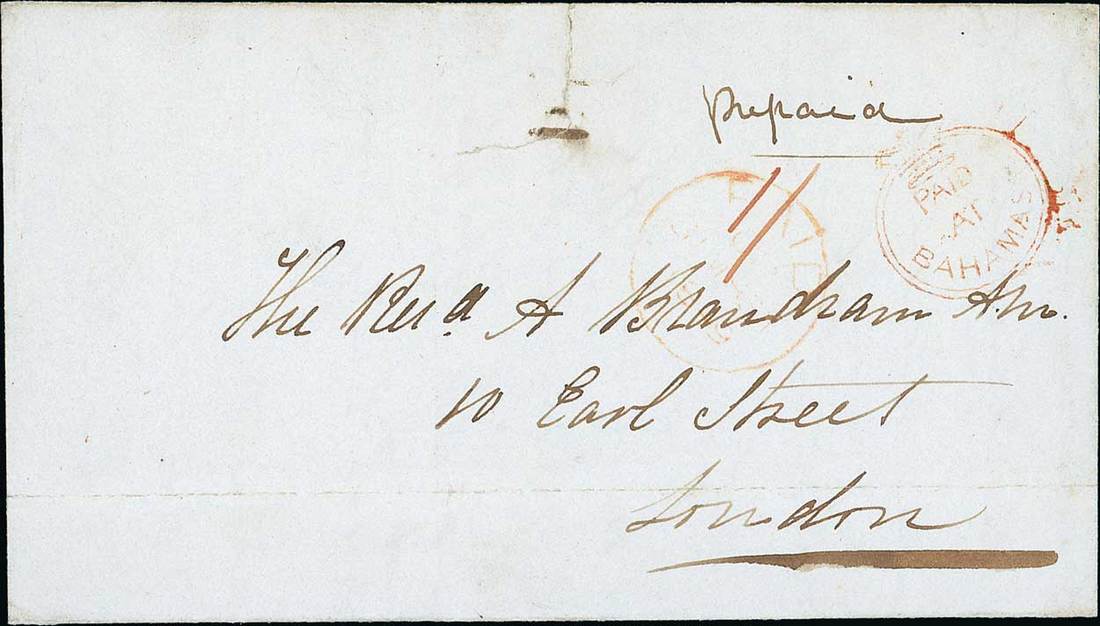 1849 (25 Jan.) entire (small tear at top) from Bahamas to London, picked up on the outbound trip of the Dee and carried through the entire Mexican route before reaching Bermuda and onward to Southampton, resulting in a five week delay, rated "1/-" and showing Crowned Circle "paid/at/bahamas" alongside light London datestamp for 31 March, superb "bahamas" double-arc datestamp on reverse. A most unusual occurrence. Photo
