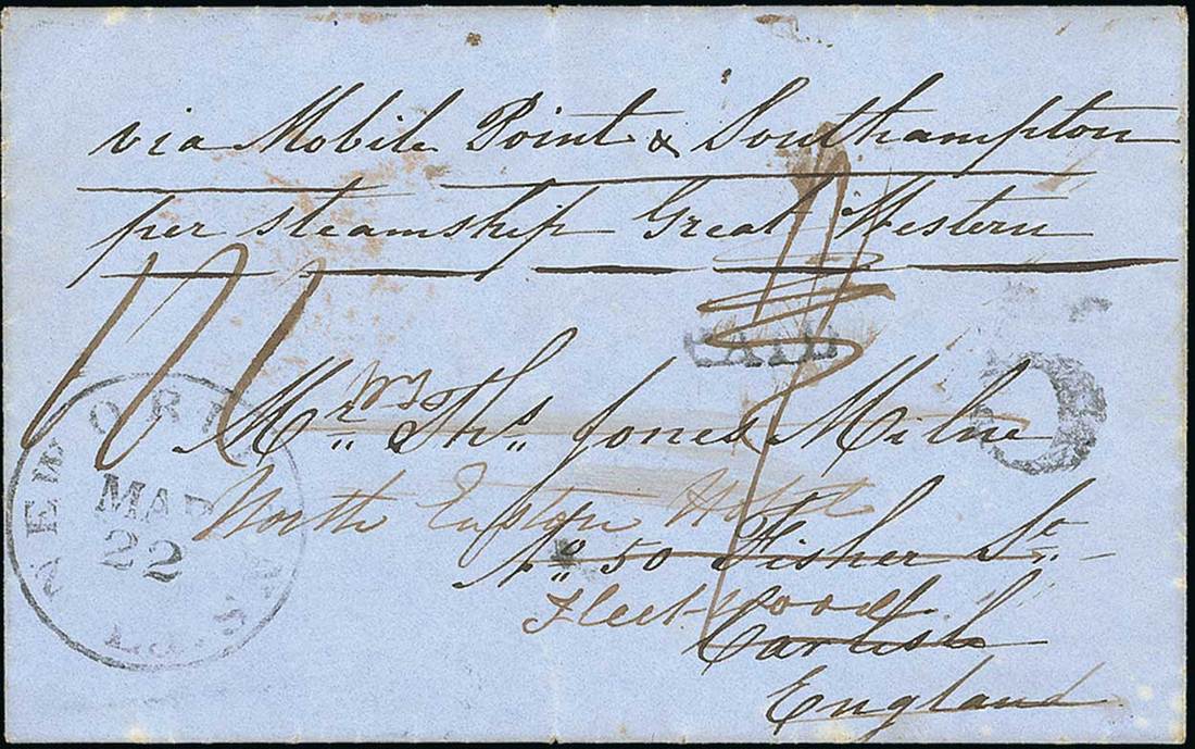 1849 (22 Mar.) entire from New Orleans "via Mobile Point & Southampton per steamship Great Western" to Carlisle and redirected locally, overland to Mobile and then per Great Western, rated with handstamp "paid" alongside "5" cents internal postage, "1/-" to England and 1d. for forwarding = "1/1", and showing New Orleans datestamp (22.3), all on face, the reverse with four U.K. transit datestamps. Covers from New Orleans and mentioning Mobile via Bermuda are exceedingly rare. Photo