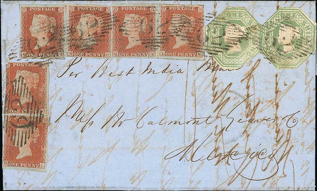 1850 (28 Feb.) entire letter from Belfast "Per West India Mail" to Mexico, per Medway from Southampton to Bermuda, bearing 1841 1d. red-brown (6) and embossed 1/- green (2, both cut-to-shape) all clearly cancelled and showing despatch and London (2.3) datestamps on reverse. An attractive and unusual fully prepaid franking. Photo