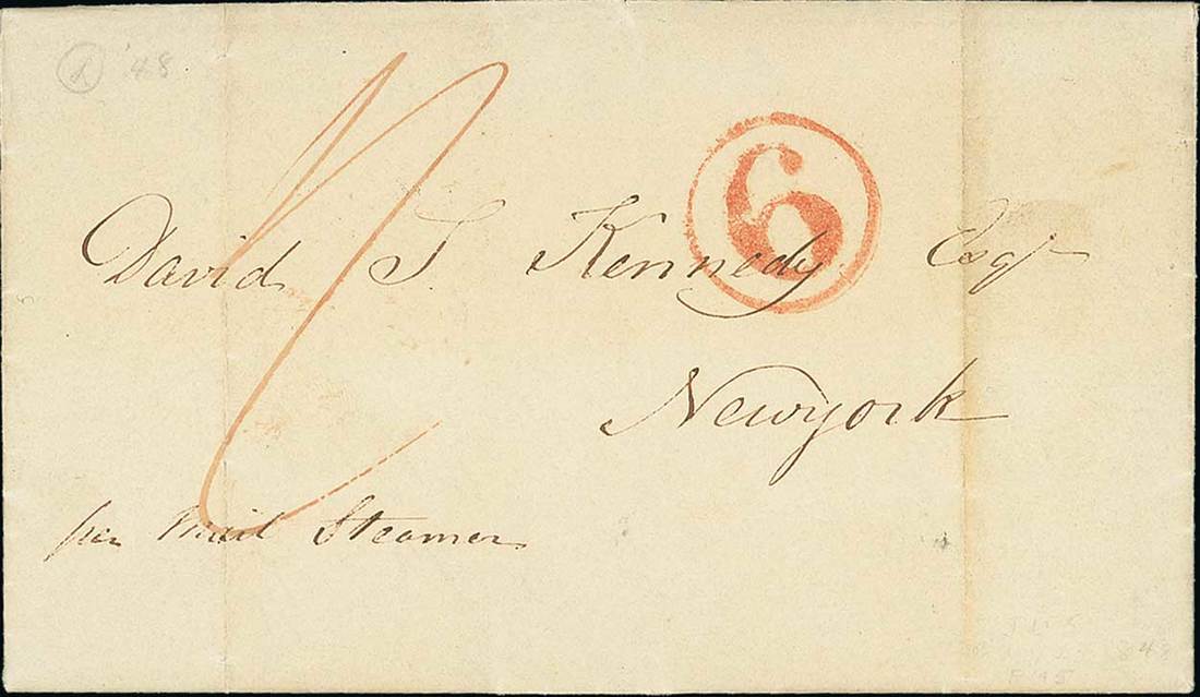 Note: Letters from the British Caribbean had to be fully prepaid at the port of entry as this cover was. It was improperly rated "6" as a ship letter (addressed to the port of entry), the correct rating being 5c.