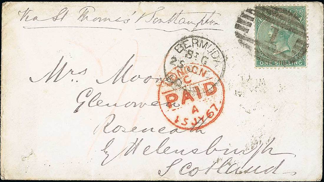 1867 (25 June) envelope from St. George's "via St. Thomas & Southampton" to Scotland, per Cunard Alpha to St. Thomas and per RMSP Tasmanian to Southampton, bearing 1865 1/- green cancelled with superb "1" (K1) and equally fine datestamp (P5) alongside partly overstruck by London Paid datestamp (15.7), Glasgow (15.7) and Hellensburgh (16.7) datestamps on reverse; most attractive. Photo