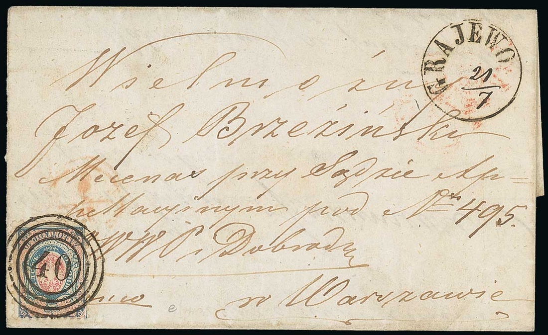 1860 10k. blue and rose, original gum and fine, two used examples with small faults and another fine used on entire to Warsaw with "40" in circles cancellation of Grajewo. S.G. 1. Photo