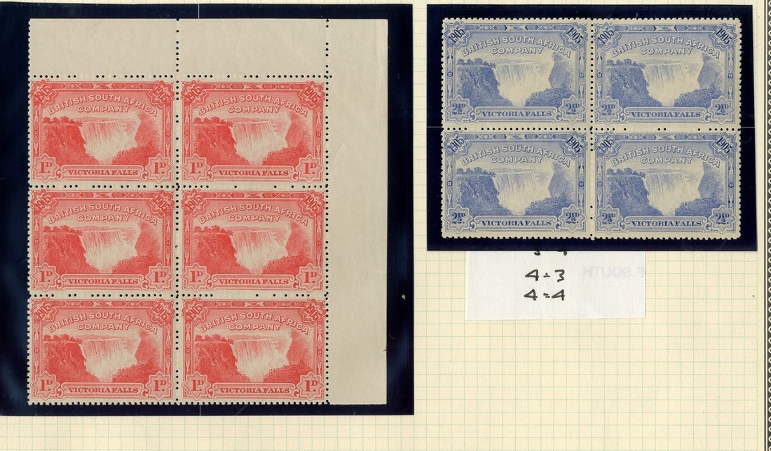 1892-1912 unused/mint range including 1892 2/6d. and 10/- (3), 1892-94 values to 3d. with a couple of blocks of four, 1896-97 values to 10/- with ½d. Plate 3 block of fifteen and 1d. Plate 4 block of twenty-four (both with stains), 1896 on Cape set, 1897 Arms values to 8d., 1905 Falls sets (2) and additional values to 1/- with 1d. block of six and 2½d. block of four, 1909-12 values to 10/-, and Arms unused postal stationery cards/envelopes (6); mixed condition with viewing recommended