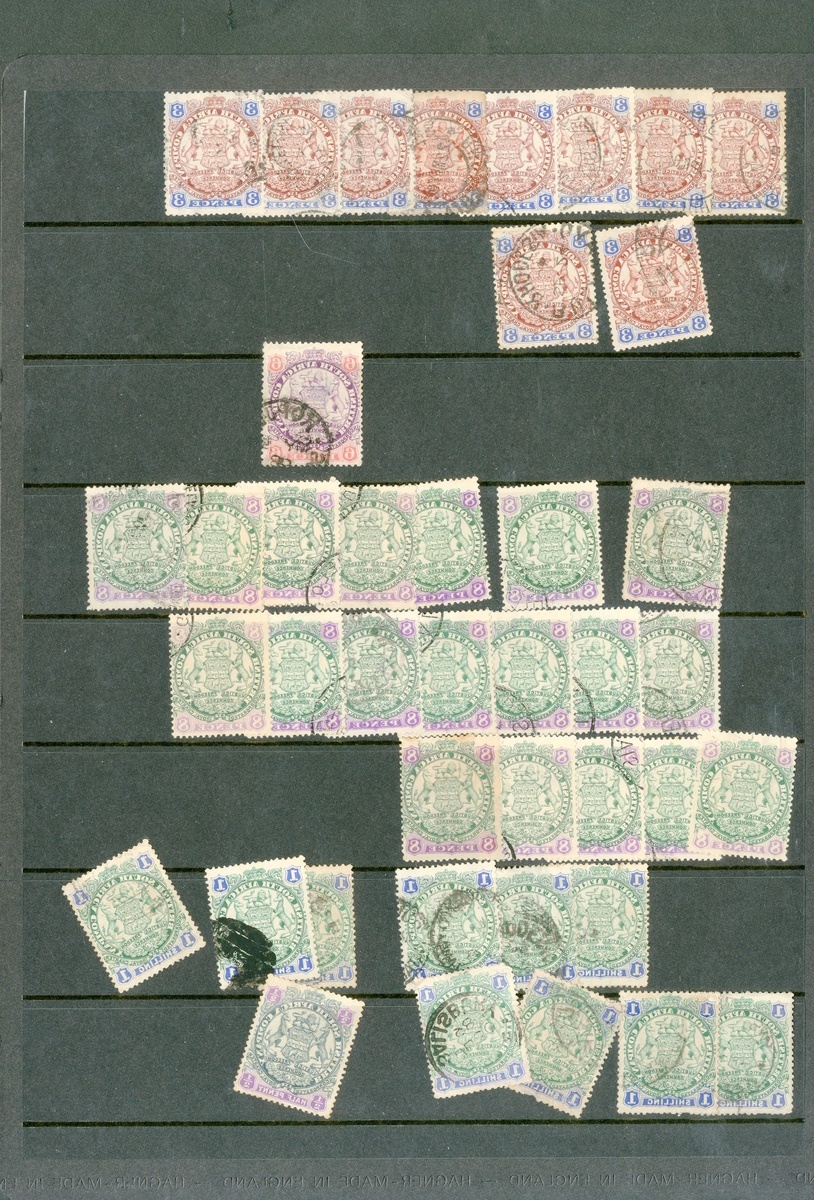 1892-1912 collection including 1d. to 10/-, £2, £5 (not guaranteed) and £10 (fiscal usage), 1892-94 set, 1896-97 Arms sets, 1896 1d. on 3d. and 3d. on 5/-, 1896 on Cape set, 1897 Arms set, 1898-1908 set to £2, £5, £10 and £20 (all three with forged cancellations, 1905 Falls set, 1909-12 set to £2, and a range of duplicates on further pages and loose in packets, etc.; condition mixed with viewing essential