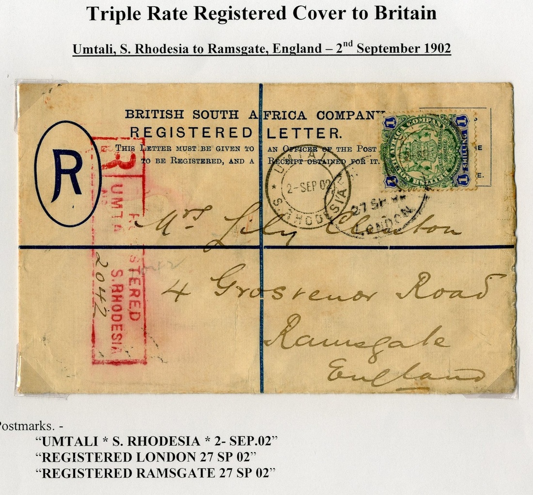 1899 (22 Sept.) H size 4d. registered envelope, uprated with 1896 1/- and 1898 1d., from Salisbury to Duidsburg with adhesives neatly cancelled by double-ring datestamps, Cape Town datestamp on reverse, and 1902 G size 4d. registered envelope, uprated with 1896 1/-, from Umtali to England, lightly cancelled by double-ring datestamp and additionally tied by London registered oval datestamp and showing at left boxed "registered/umtali s. rhodesia" registration handstamp in red. An attractive pair