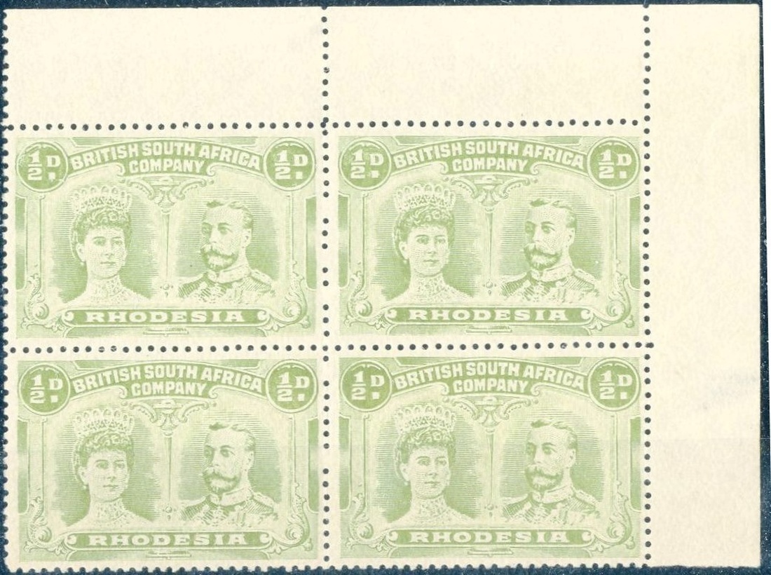 ½d. olive-green shade upper right corner block of four, [4-10] fresh mint with the stamps remaining unmounted; two thins in margins and the usual diagonal gum creases, very fine appearance. RJL 3