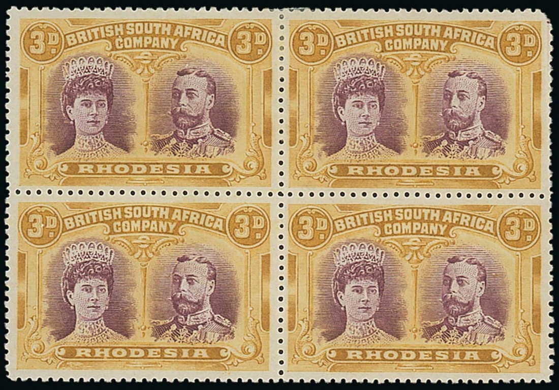 3d. magenta and yellow-ochre block of four with printer's mark at upper right, fresh mint with the lower pair unmounted; a couple of gum creases and slightly rounded upper right corner though a rare and attractive multiple. S.G. 136. Photo