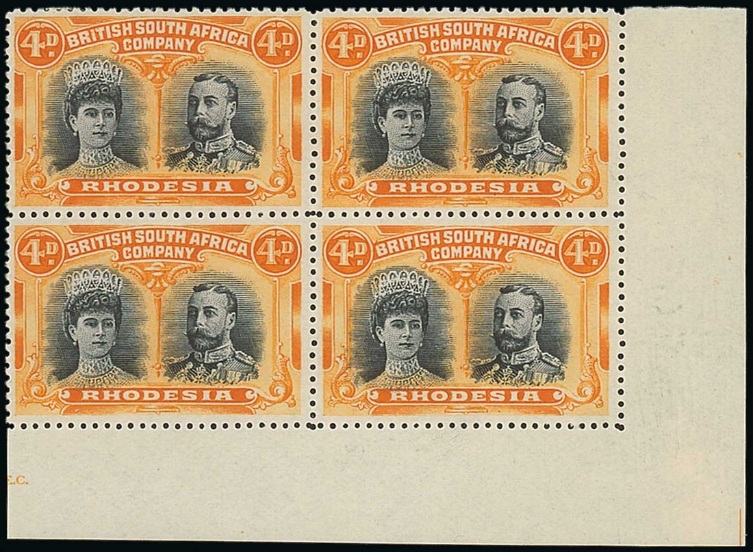 4d. greenish black and orange lower right corner block of four, [44-50], [44] King's wisp fresh mint with the lower pair remaining unmounted. A fine positional multiple. S.G. 138. Photo
