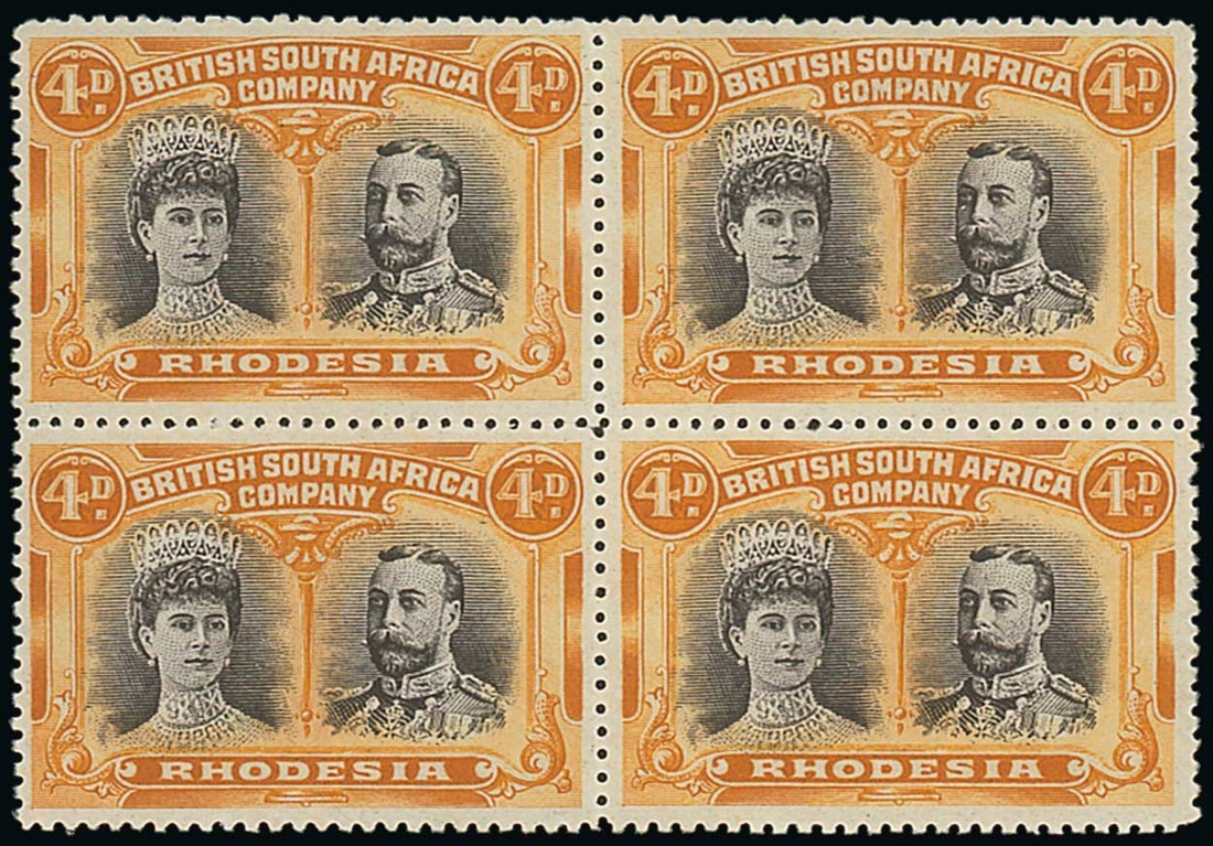 4d. brown-purple and orange block of four, fresh mint with three remaining unmounted. S.G. 139. Photo