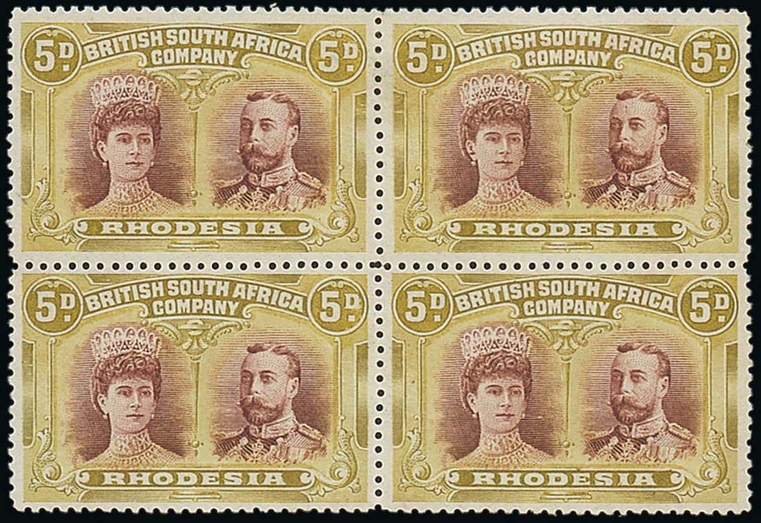 5d. purple-brown and olive-yellow block of four, [1-7], [2] Long gash in Queen's ear, fresh mint. A most attractive positional multiple. S.G. 141a. Photo