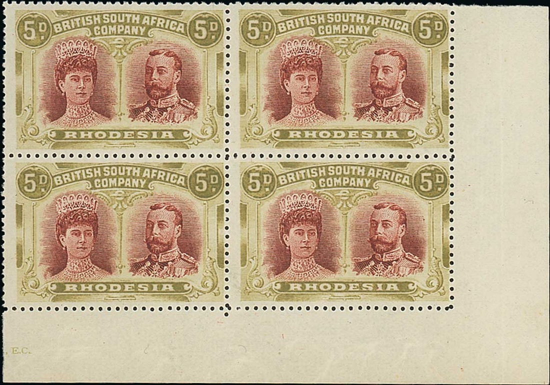 5d. lake-brown and olive lower right corner block of four, [44-50], fresh lightly mounted mint with the lower pair remaining unmounted. A rare positional multiple of this distinctive shade. S.G. 143. Photo