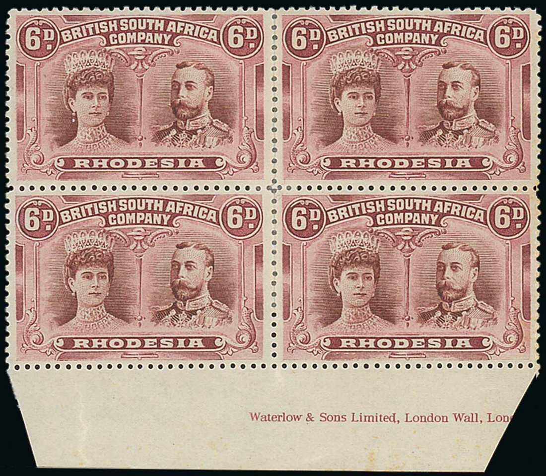 6d. red-brown and mauve marginal block of four from the foot of the sheet, [42-48], with large imprint, large part original gum; perfs. strengthened at centre and a few very light tones on right-hand perfs. S.G. 144. Photo