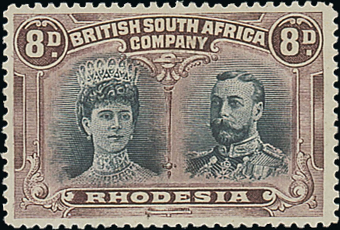8d. black and purple showing the true smoky black heads, part original gum. A very presentable example of this very rare printing. S.G. 146, £6,500. Photo