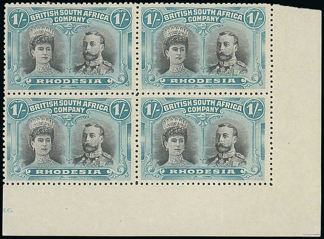 1/- grey-black and blue-green lower right corner block of four, [44-50], with guillotine guide lines, fresh mint with a few hinge marks. Fine and most attractive. Photo