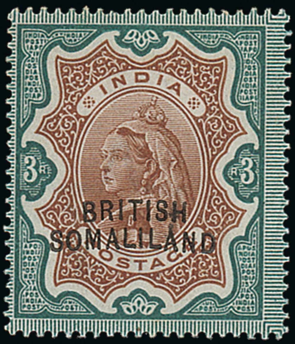 3r. brown and green, curved overprint, original gum, a couple of slightly toned perfs., fine and scarce. B.P.A. Certificate (2012). S.G. 23b, £950. Photo