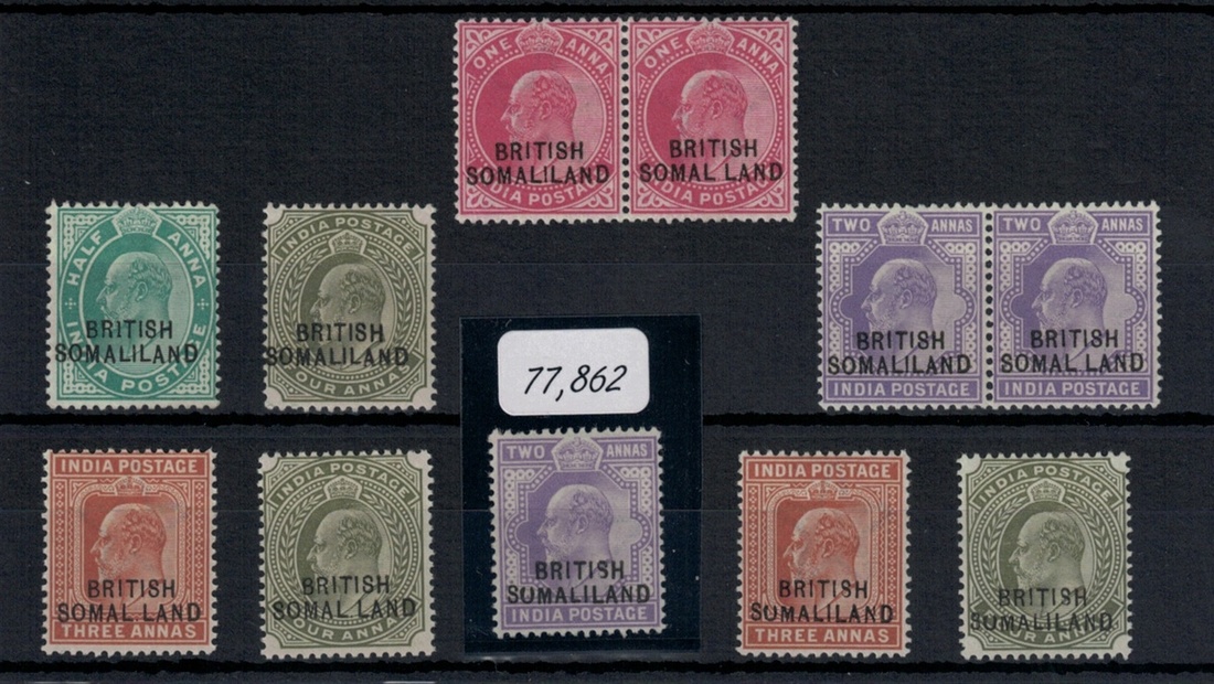 ½a. green and 4a. olive, variety "br1tish", 1a. carmine, 2a. violet 3a. orange-brown and 4a. olive variety "somal.land", 2a. violet, 3a. orange-brown and 4a. olive variety "sumaliland", original gum, two in pair with normal and one (S.G. 27c) with B.P.A. Certificate (2011). S.G. £1,475