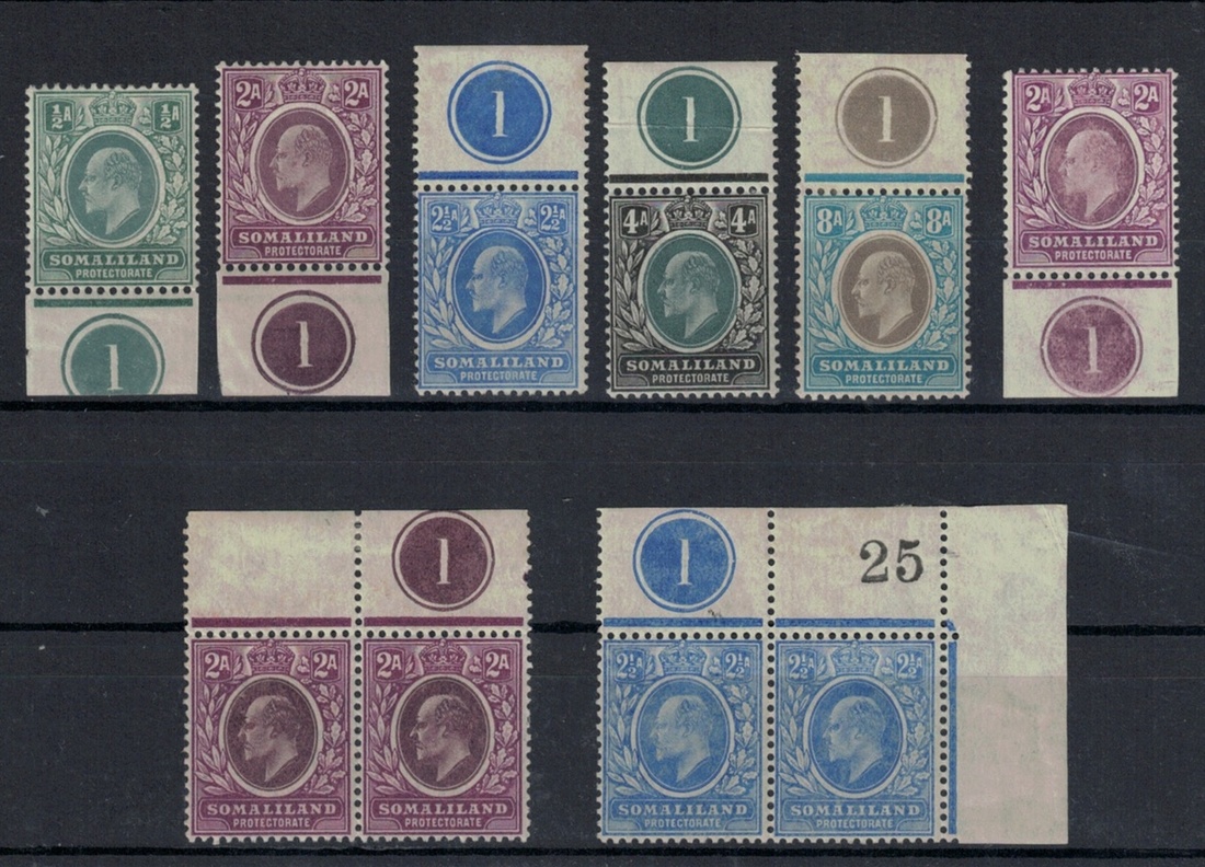 1904 ½a., 2a., 2½a., 4a. and 1905-11 2a. (3 with a pair), 2½a. (3 with a corner pair with sheet number "25") and 8a., all marginal with plate number, good to fine mint