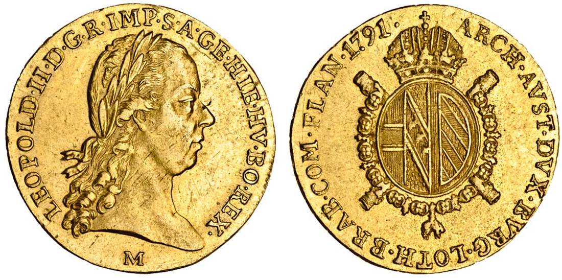 Italy, Milan, Leopold II (1790-92), Half-Sovrano, 1791, laureate head right, rev. crowned oval shield (Crippa 3b; F.739e; KM.232), small marks around the edge from a mount otherwise about extremely fine
