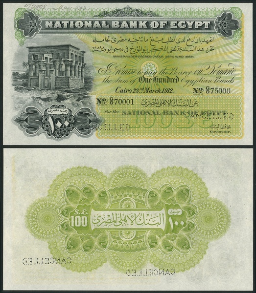 (x) National Bank of Egypt, printer's archival specimen £100, 2 October 1912, serial run G/9 70001 to G/9 75000, black, yellow-green and orange, the temple at Philae at left, value at lower left, reverse olive-green, value in western numerals at left and Arabic numerals at right set in ornate guilloches, perforated SPECIMEN