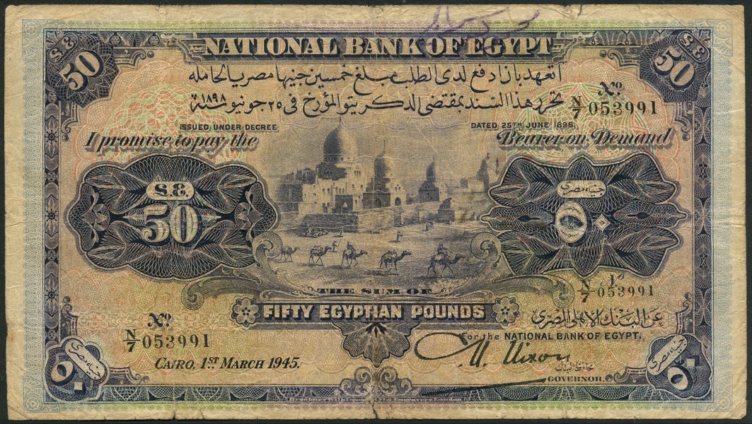 (x) National Bank of Egypt, £50, 1 March 1945, serial number N/7 053991, purple and beige, camel train and Mosque at centre, value at left and right and at each corner, Nixon signature, reverse purple, pale pink and green, value at each corner