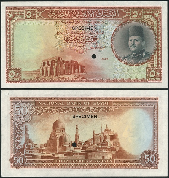 (x) National Bank of Egypt, colour trial £50, ND (1949), no serial numbers, red-brown on multicolour underprint, King Farouk at right, temple ruins at low centre, value at each corner, reverse view of Cairo, small black SPECIMEN overprint and one cancellation hole