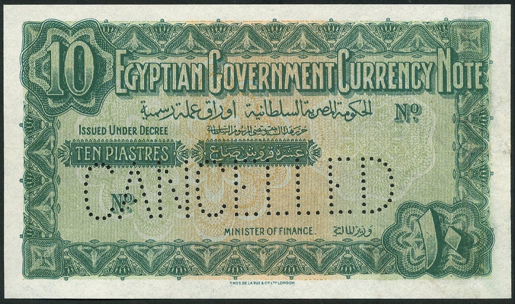 (x) Egyptian Government Currency Note, specimen 10 piastres, ND (1916-7), no serial number, green, on orange and green underprint, value at top left and low right, reverse blue, Collossi of Memnon at centre, perforated CANCELLED