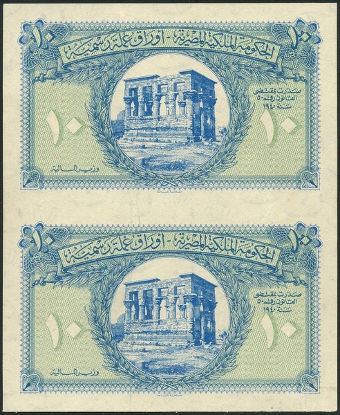 (x) Government Currency note, uncut pair 10 piastres, ND (type of 1940), no serial number, blue and pale green, the Temple of Isis at Philae at centre, value at left and right, reverse pink underprint pattern