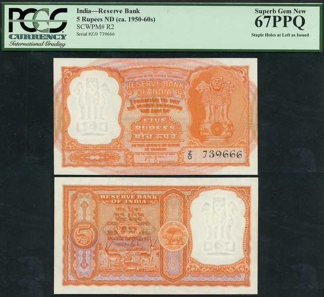 (Pick R2, Razack-Jhunjhunwalla 6.12.2.1), usual staple holes at left, in PCGS holder number 67 PPQ, superb gem uncirculated, rare especially in this grade