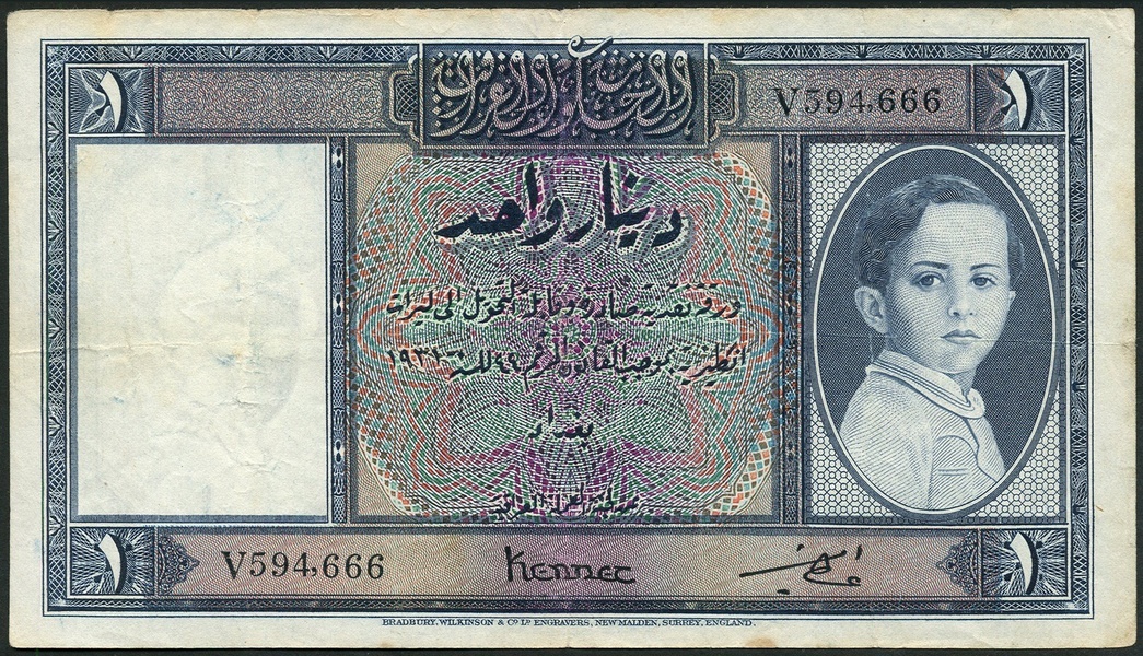 (x) Government of Iraq, 1 dinar, law of 1931, (1942), serial number V594,666, blue and lilac, King Faisal II as a child at right, value at each corner, signatures of Kennett and Ata Amin, reverse blue