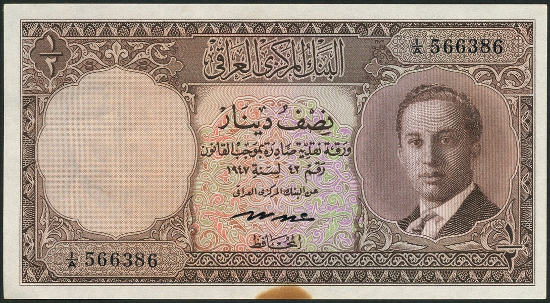 (x) Central Bank of Iraq, consecutive pair 1/2 dinar, 1947, serial numbers 1/A 566385-6, brown and multicoloured, King Faisal II as a young man at right, Abdul Ilah Hafudh signature