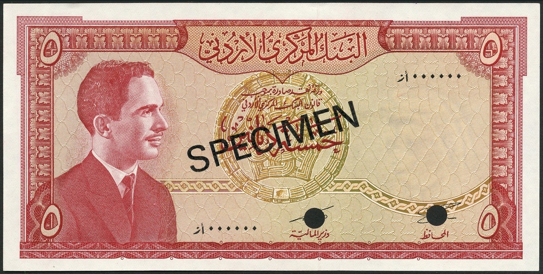 (x) Central Bank of Jordan, a specimen set from the 'first series' without law date issue, 1/2 dinar (2), brown, 1 dinar, green, 5 dinars (2), red, all with King Hussein at left, black SPECIMEN overprint, perforated