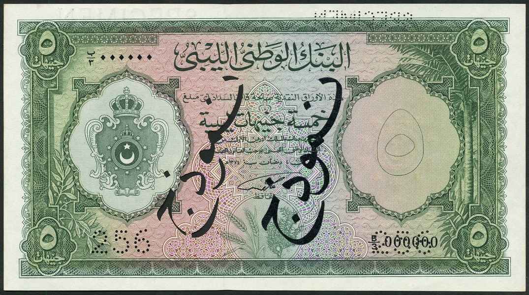 (x) National Bank of Libya, specimen £5, 1955, serial number B/3 000000, green and multicolour, arms at left, value in each corner, ornate border, reverse, guilloche patterns, perforated 256 and SPECIMEN overprinted in Arabic on obverse and English on reverse