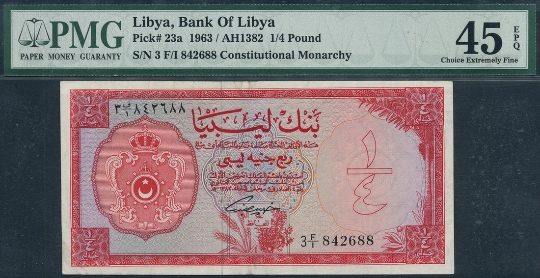 (x) Bank of Libya, 1/4 Libyan pound, 5 February 1963, serial number F/1 842688, red on pale blue and lilac, arms at left, wheat and jolbann plant at low centre, value in each corner and at centre right, reverse, guilloche patterns