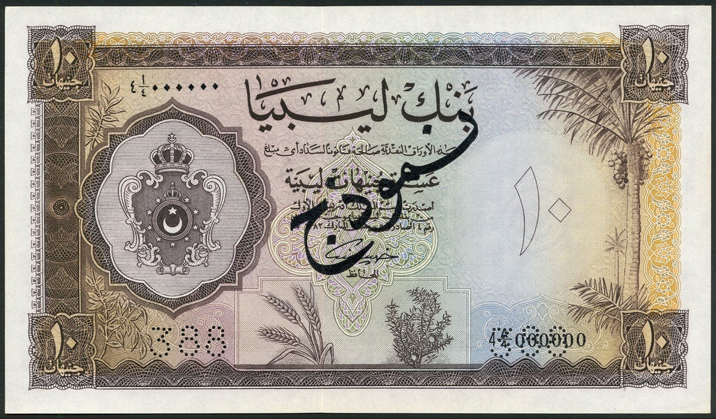(x) Bank of Libya, specimen 10 pounds, 1962, serial number 4 A/4 000000, brown on multicolour underprint, arms at left, value at right and each corner, reverse brown, Khalil Al Bennani signature, perforated 388 and SPECIMEN, Arabic overprint on obverse and English on reverse