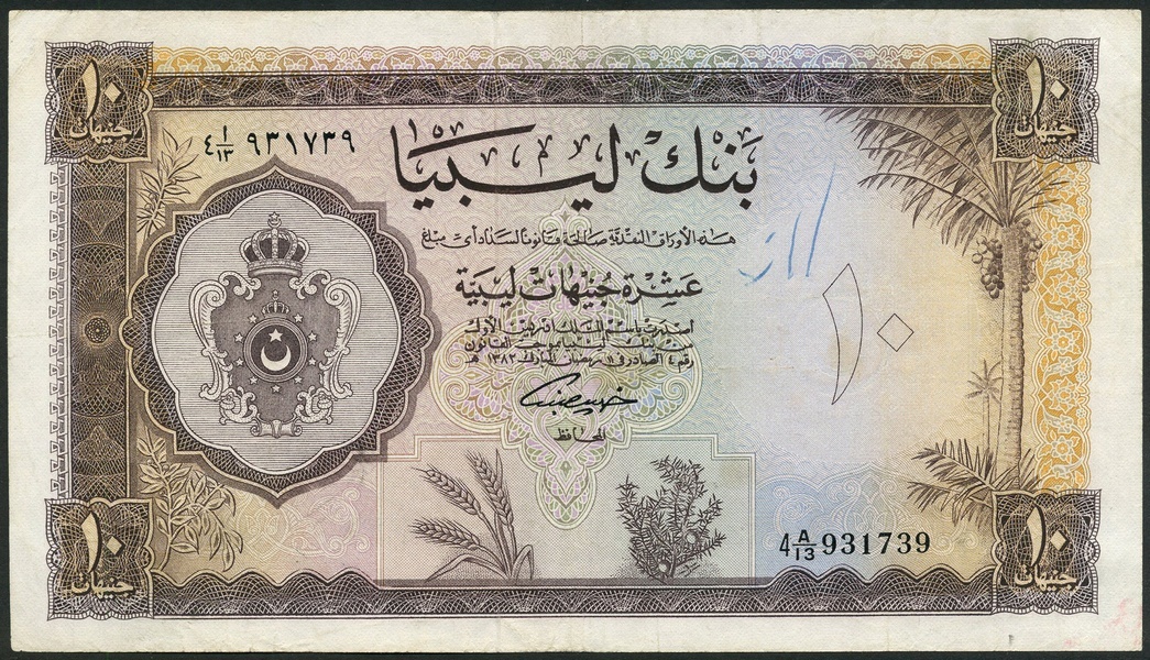 (x) Bank of Libya, 10 pounds, 1962, serial number 4 A/13 931739, brown on multicolour underprint, arms at left, value at right and each corner, reverse brown, Khalil Al Bennani signature