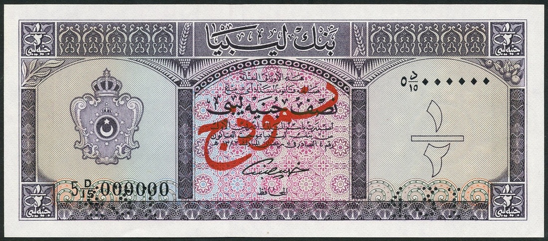 (x) Bank of Libya, specimen 1/2 Libyan pound, 1963, serial number 5 D/15 000000, purple on multicolour underprint, arms at left, ornate border, reverse, bank title top centre, value in each corner and at centre, perforated 431, red SPECIMEN overprint in Arabic on obverse and English on reverse,
