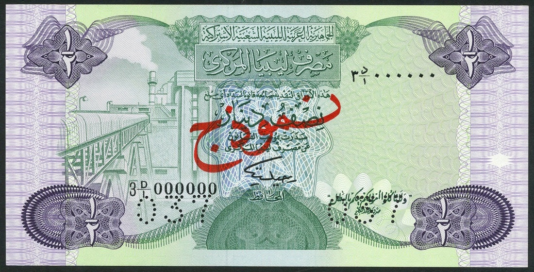 (x) Central Bank of Libya, specimen 1/2, ND (1984), serial number 3 D/1 000000, purple, green, and blue, petroleum refinery at right, reverse green, Irrigation system above wheat field, perforated 037, red SPECIMEN overprint in Arabic on obverse and English on reverse