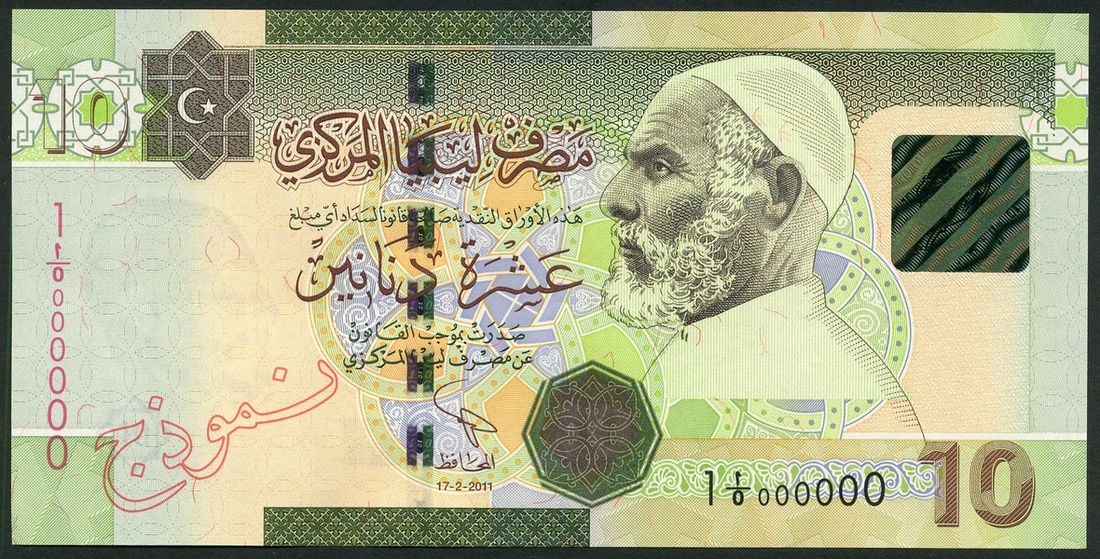(x) Central Bank of Libya, specimen 10 dinars, 2007, serial number 7 1/251 000000, green, Omar El Mukhtar and hologram at right, reverse hilltop fortress in Sabha, red SPECIMEN overprint