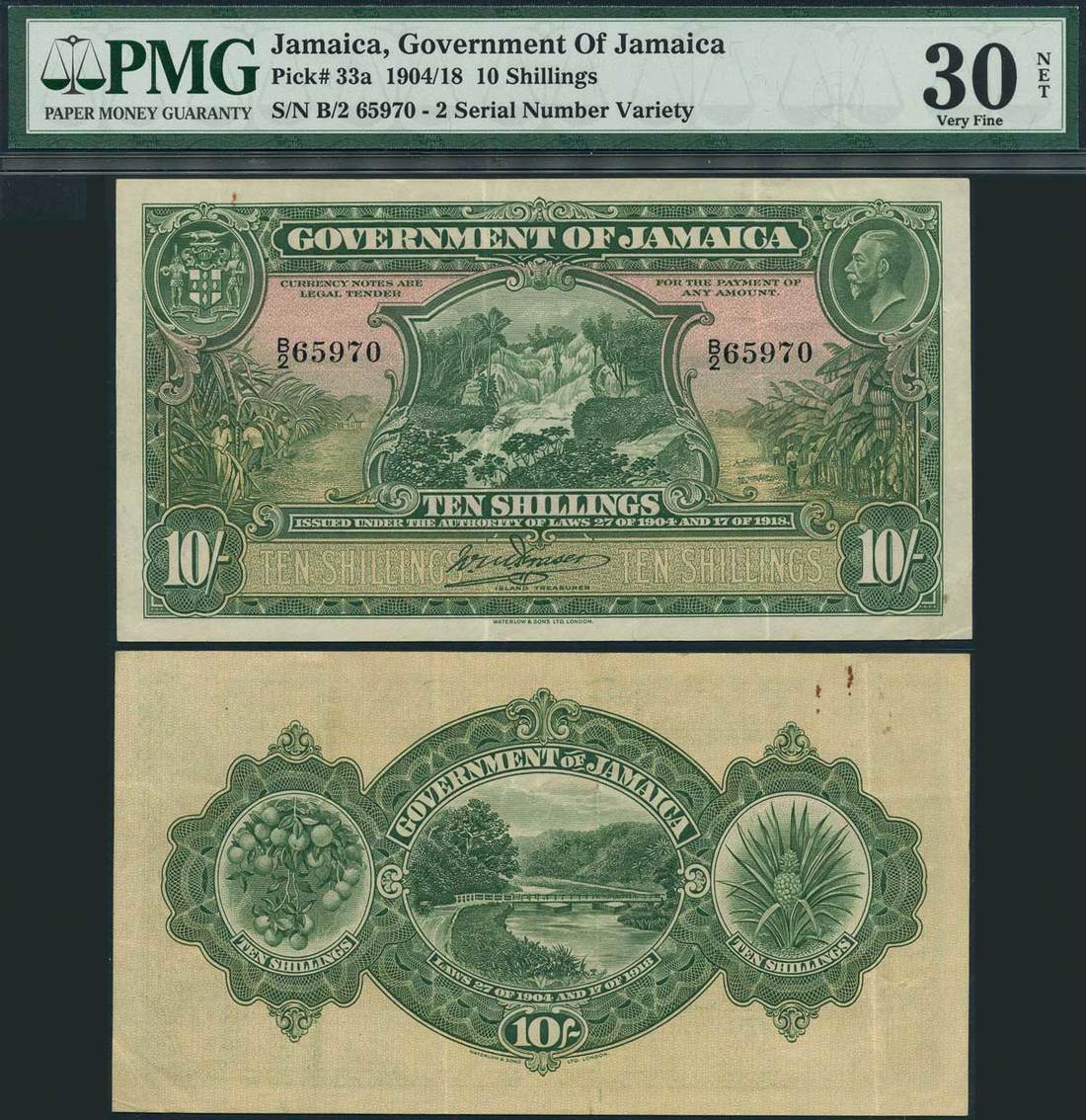 (x) Government of Jamaica, 10 shillings, 1918, serial number B/2 65970, green on multicolour underprint, George V at top right, arms at top left, sugar and banana harvest at left and right, Roaring River Falls at centre, reverse green, bridge at centre