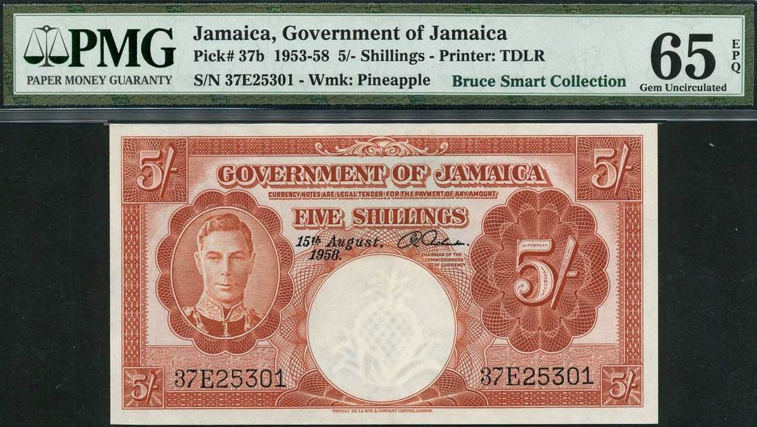 (x) Government of Jamaica, 5 shillings, 15 August 1958, serial number 37E25301, red-orange, George VI at left, value at right and each corner, reverse orange, purple and green, arms at top centre