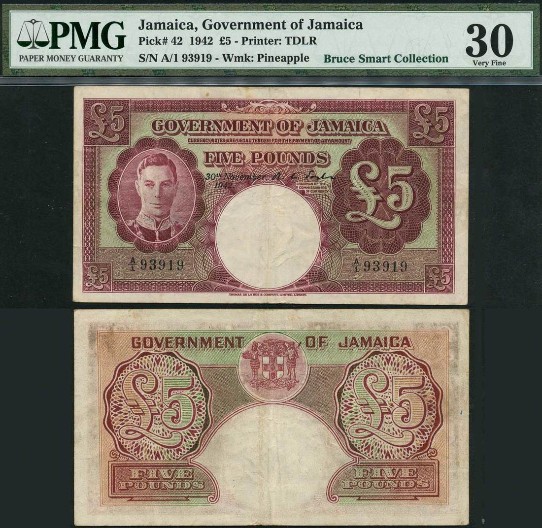 (x) Government of Jamaica, £5, 30 November 1942, serial number A/1 93919, maroon on multicolour underprint, George VI at left, value at right and each corner, reverse maroon, green and orange, arms at top centre